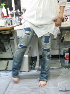 今回は破れた部分のうらに、インディゴ染めのニット地をあてサイドだけにタタキをいれました
