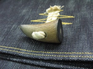 使用しているボタンは本水牛のダッフルボタン、このボタンなんとハンドメイドでサイズやデザインも一個一個違います。まさに付属まで一点もの。