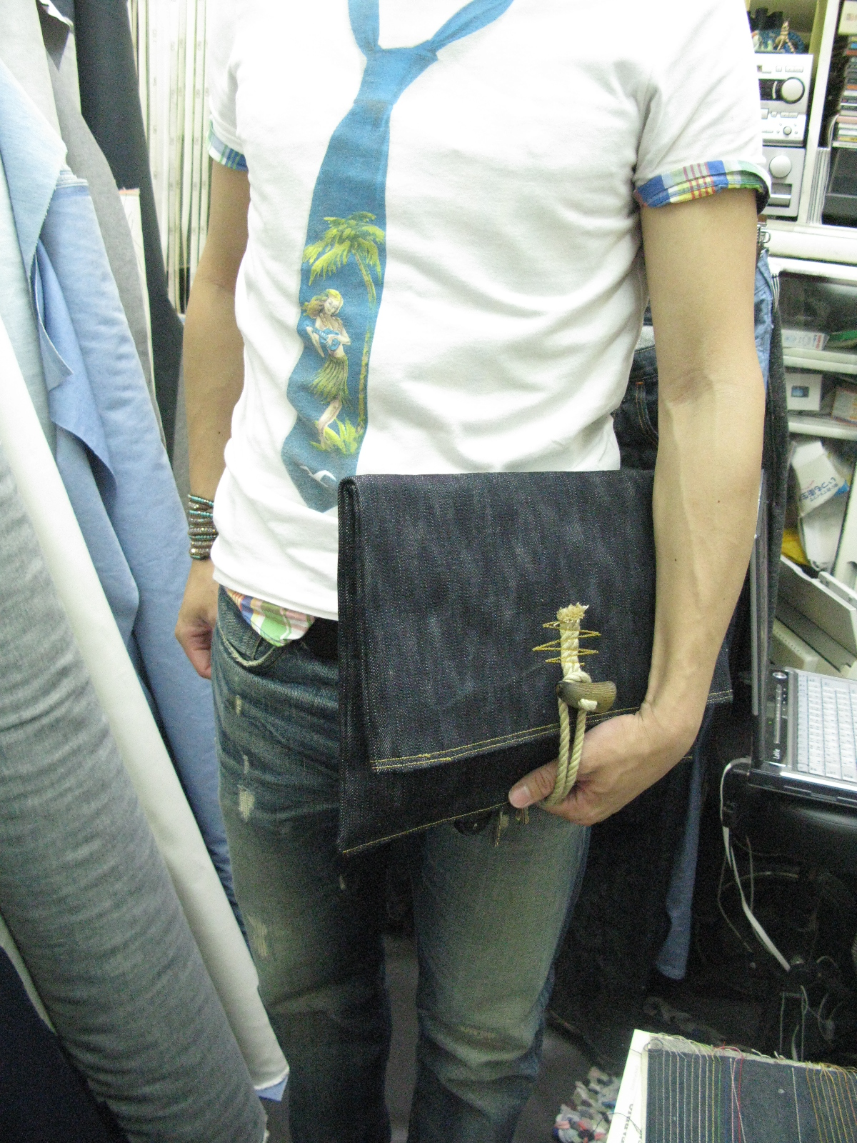 クラッチバックは新しい旬のアイテムですが、永く使って頂きたいのでタフにシンプルに製作いたしました。製作はジーンズとは違い、シンプルですが《顔》になるアイテムなので、いつもと違う神経を使いました、新鮮~~~